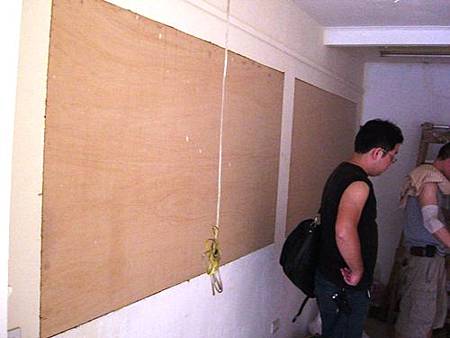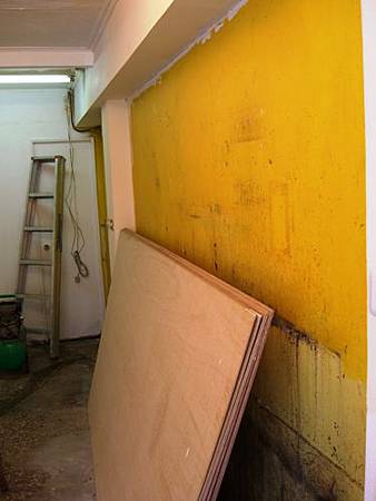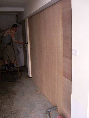 木作裝潢說明:另一個牆面,需要包覆水管跟鋒面。因為該面要承重所以用四分板下去封面,到時要掛櫃子、層板都會比較有支撐力