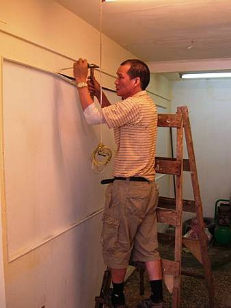 木作裝潢說明:有兩塊凹陷處要封板,父親用鑿子將原有線板撬除,然後封板,因為厚度只有3公分,所以需要將角木裁切為較薄的尺寸才能做好結構,之後才能封板,這是處理上比較麻煩的地方