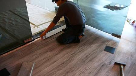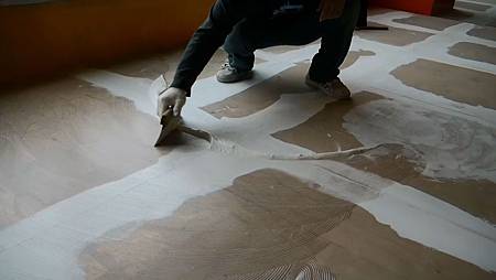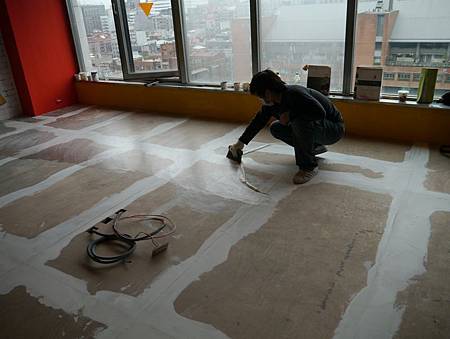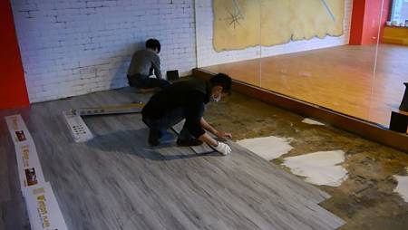 商業空間裝潢施工圖:上壓感膠,壓感膠塗膜後,要等它乾,之後才能黏貼塑膠地板,而且壓感膠越乾會越黏,所以就算兩周內把塑膠地板斯起來,黏性依舊在。所以如果施工中若有磨損,只需斯下塑膠地板,直接黏貼新的上去就可以了