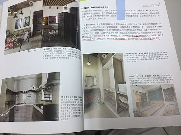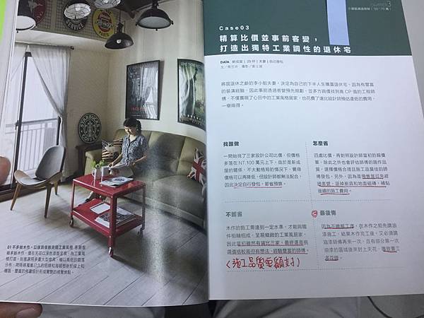 [ 小爆雷 ] 接著,主要就是屋主們現身說明他們裝潢的感受跟心得,這是一大賣點,書中做了幾個指標,我覺得很不錯,主要指標找誰做、怎麼省、有不能省、最滿意、最後悔。 因為來自消費者切身的說明,對我的感受會更深,我是滿喜歡的。