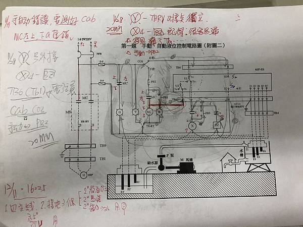 2017年12月11日_水電室內配線丙級第三次實作接線。 個人會在圖面上做記號,記錄接錯的地方,也會記錄時間。 第一次接線十題平均時間大約坐落在23分鐘,正確率80%,需要檢修的問題一多,十題有兩題要查個半天才能知道問題,而且試動作也是二二六六的。