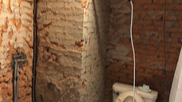 這個牆分割了兩間廁所,但是這堵牆面砌磚沒有頂天,所以我們只能單面打到見底,另外一面僅能剔除磁磚,雙面打見底是有風險的,因為結構力不足,我們不敢保證是否磚牆是否會坍塌,這裡告訴我的經驗學習是: 磚牆要砌磚到頂。 場勘跟打除之前都要注意磚牆是否有頂到天花板。