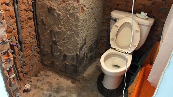 馬桶旁邊可以看到管道間,管道間打到見底不是不行,但如果管道間的砌磚鬆散,打著打著,讓磚鬆脫往管道間內掉落,這事情就大條了,我們不知道哪一條水管、排水管會被砸破,後續修復的問題麻煩了。 因此,管道間的打除也是要很注意的,無法見底的時候,我們不會勉強去做的。