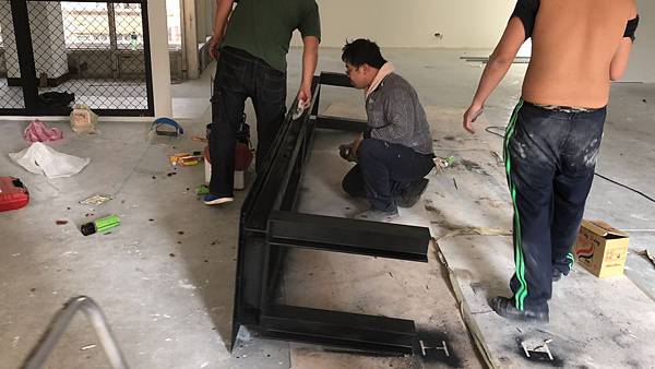 到了定點,我們五個人合力把板子放上去之後,再從底部固定桌板。