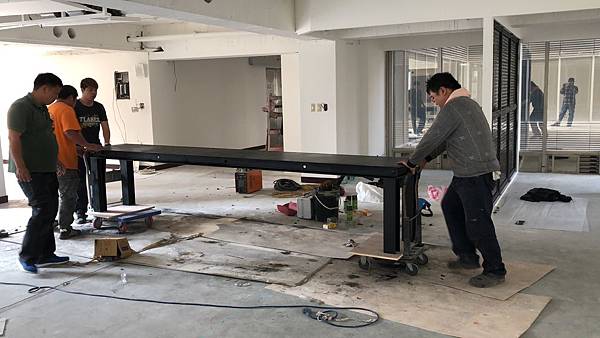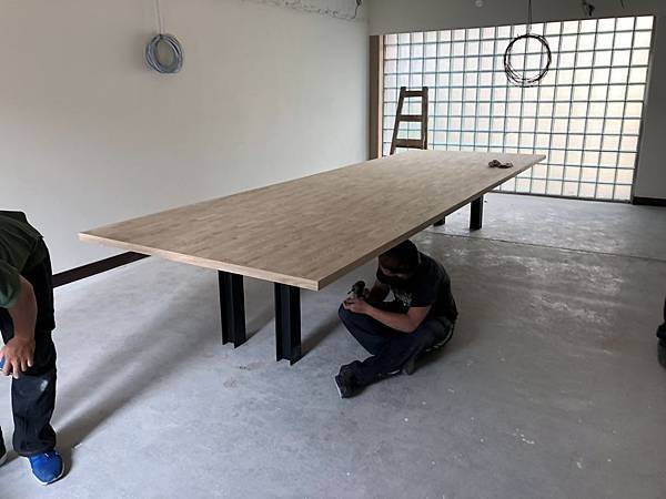 這是一張量身訂做的大桌子,桌子的尺寸是150cm寬 * 450公分長,因為超出正常尺寸,所以要訂做。 我們木工先用木心板跟皮板做出桌板,後續鐵工再進場燒鐵腳。