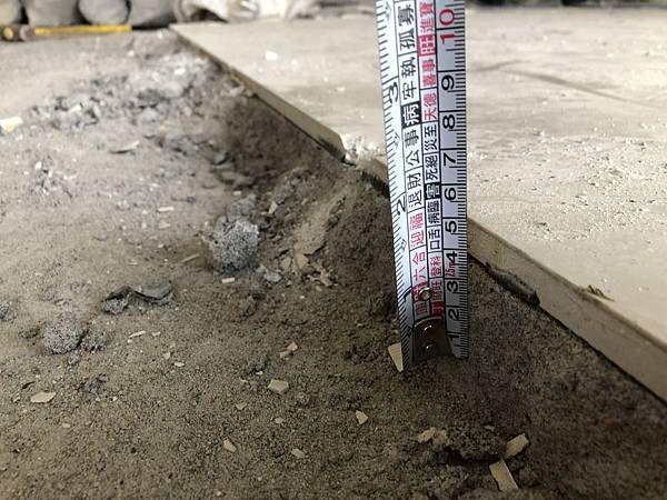 建議大家丈量厚度,這個涉及到兩個問題,一個是未來完成面高度,一個是打除清運的費用計算,一般來說,地面打到見底是5公分以內,超過這個厚度拆除清運費用自然要調整。這些問題常發生在買賣投資客的房子,我自己就吃過虧,有一次打下去,居然底下還有兩層磁磚才見底的,厚度超過15公分厚 ! 打除工跟垃圾的費用馬上翻倍 ! 不可不慎。