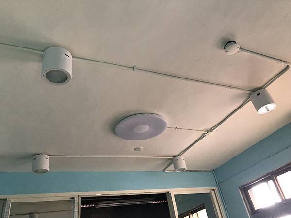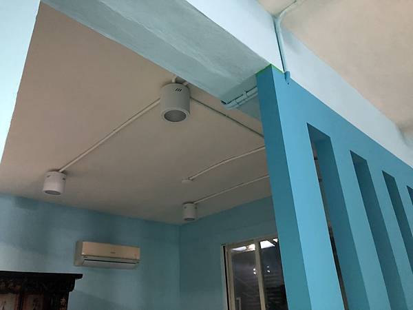 水電走明線,燈具是客人買的,我們協助安裝。水電工程還包含全室就電線抽換,加大進屋線為22平方,以及協助台電請電的部分。