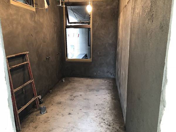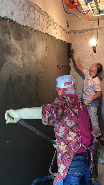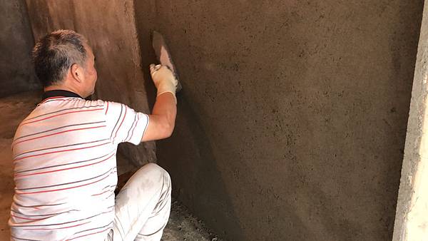 這個案子因為打到見底,表面凹凸也比較嚴重,所以打底的時候要注意,接著面的土膏要填滿孔縫,這個動作大家可以看到師傅帶著手套下去搓,把縫隙填滿。這個動作費工,也容易髒手,所以師傅省略也是可以的,相信客人很難知道,這就是謹慎的師傅跟嫌麻煩的師傅的差異點了。 填好土膏,後續就是打底,如下圖所示: