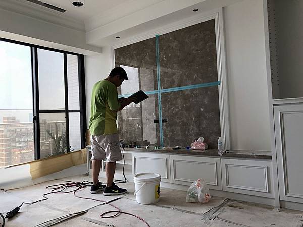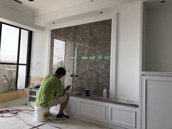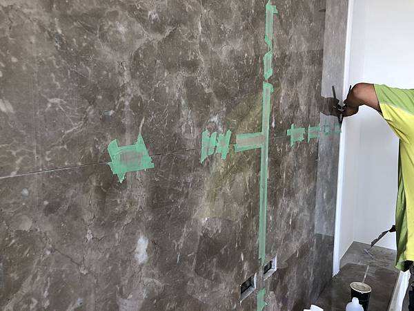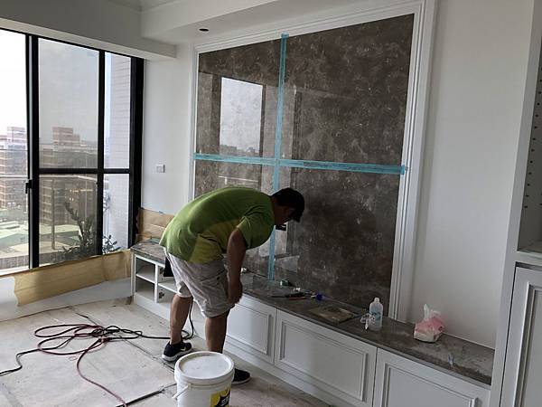 石材美容。 先用貼紙貼再縫隙邊邊,在用Epoxy +顏色調色,因為顏色帶白色,所以要分段下去作色。 首先局部填縫,作淺色帶點白色的。
