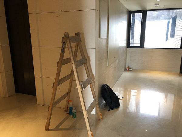這是裝潢常見的保護工程,現在的薄夾板很容易彎曲,導致膠帶有時候要用比較黏的透明膠帶才黏得住,拆除後的殘膠問題也跟著變大,以前用環保去漬油(中油有賣)就可以處理了,現在都不清不太起來,這個案例就發生這樣的問題,清不乾淨。下圖有殘膠,看不太出來,但是用手摸就感覺的到了。