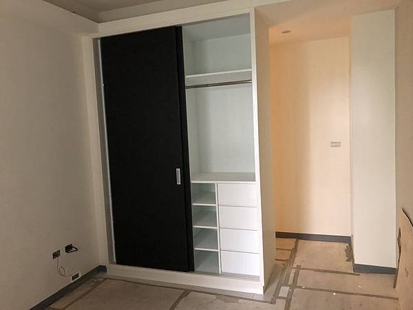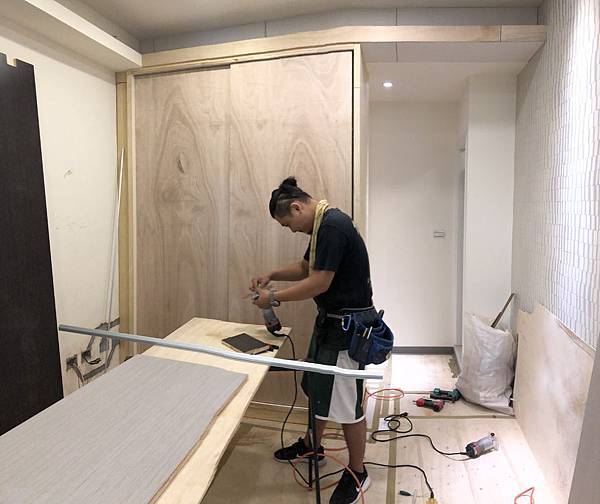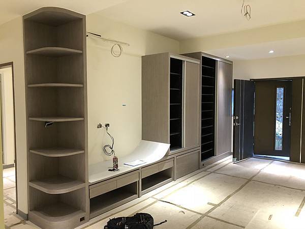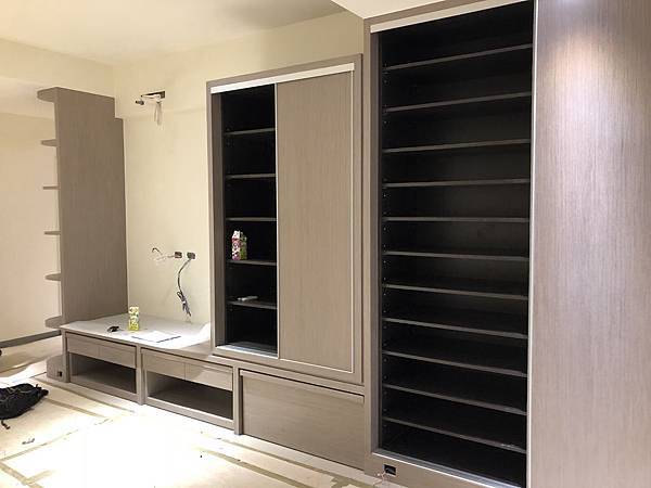 這個案子客人要比較特別的櫃子,所以只能用木工去做了。 主要作鞋櫃、電視櫃跟兩個衣櫃,上下圖客廳櫃子的部分