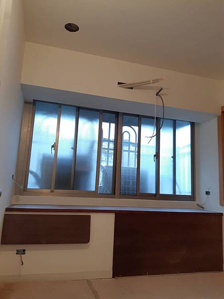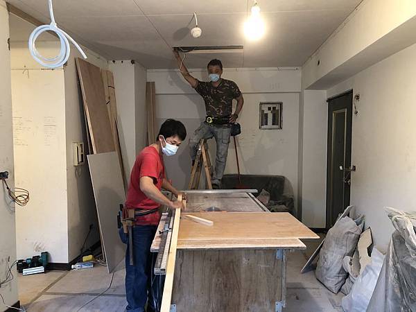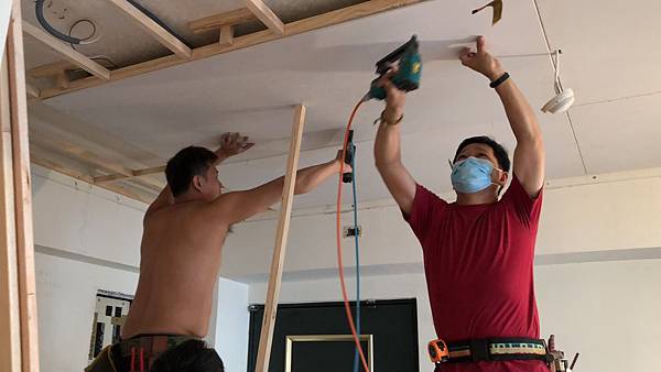 木工進場,主要施作木作天花板、窗簾盒的部分,這也是現在木工僅存的工作了 ! 如上圖客廳下角材,下圖是對外窗區的窗簾盒。