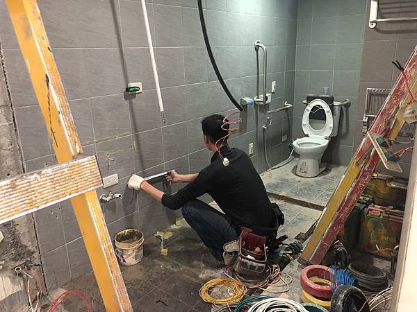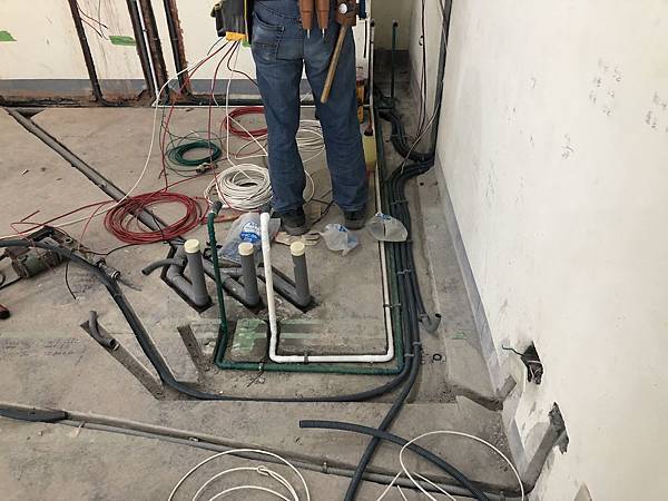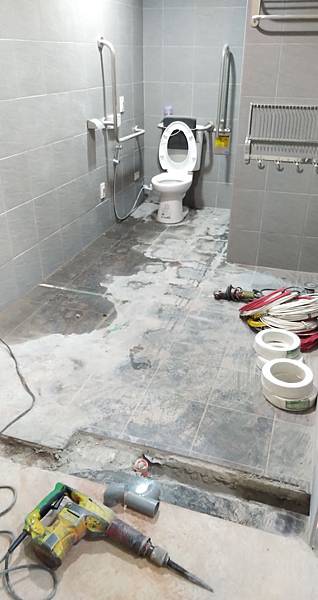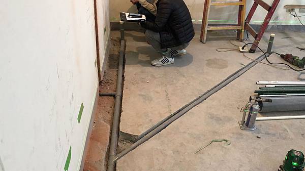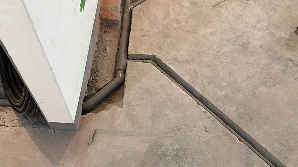 排水管配置。 為了配置排水管,只能把廁所地板打開,後面再修補了。 後來地板都還要重新貼磚處理了。