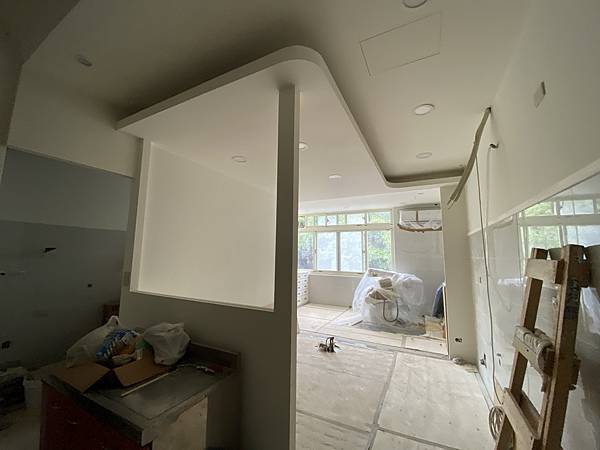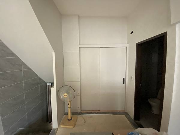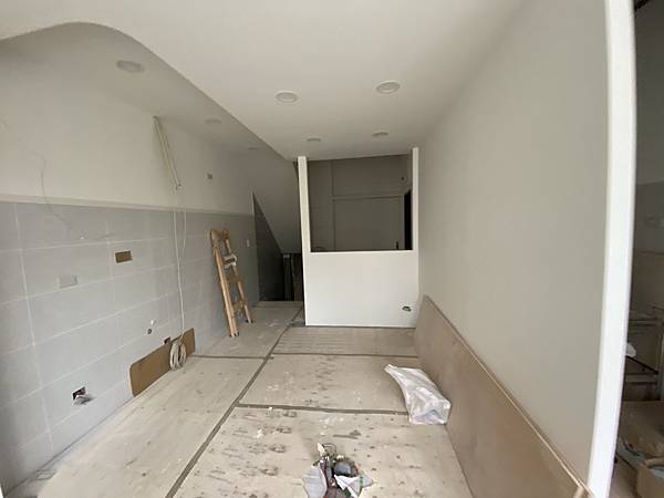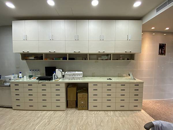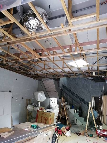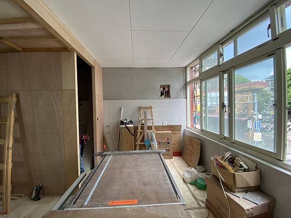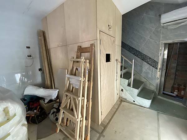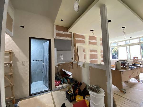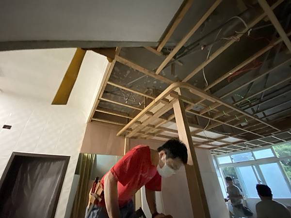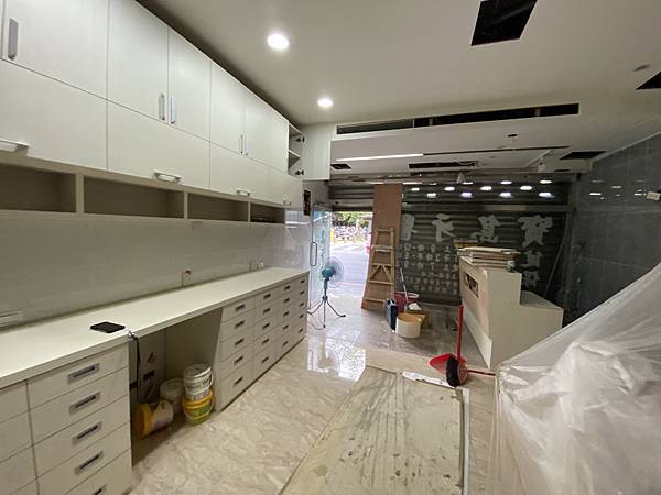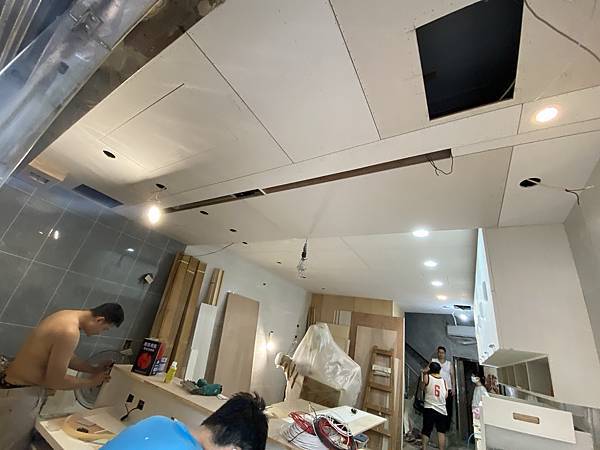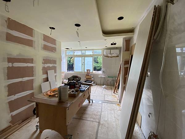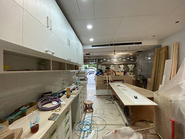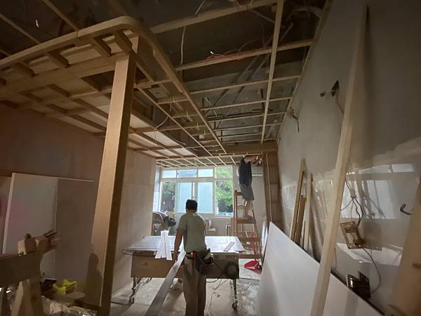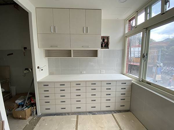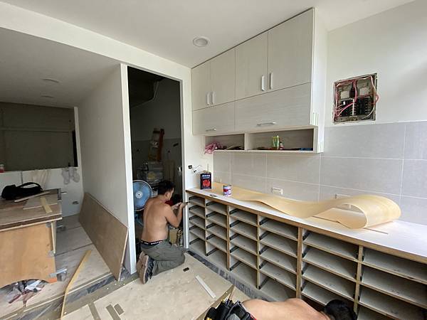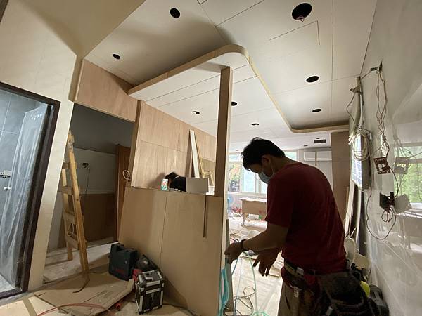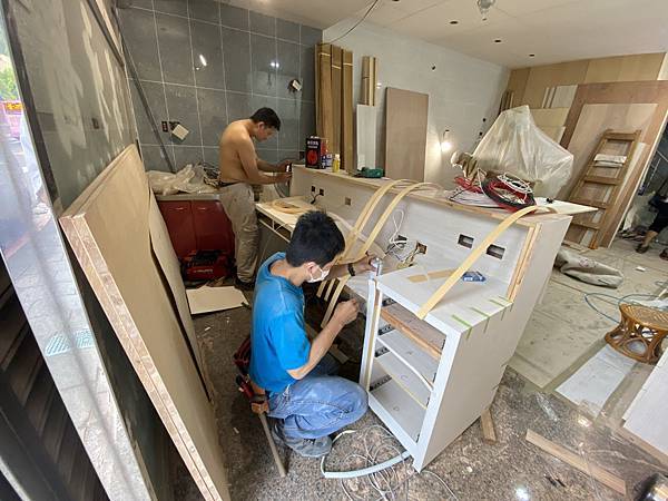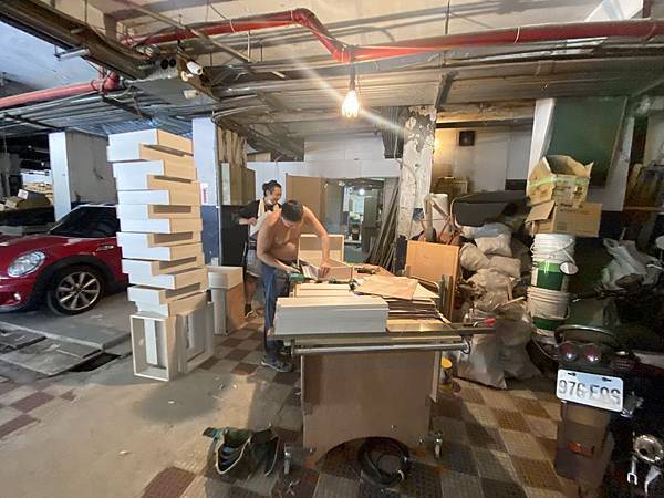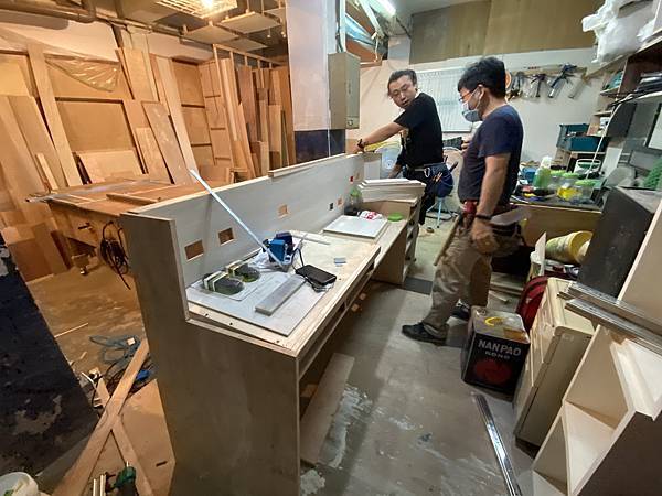 這個案子比較趕,一二樓需要分次施工。因此,我們把櫃子可以拆分回工廠做的,加上現場同步施工,藉此加速工作進度。上圖跟下圖是在工廠做櫃子的狀況。