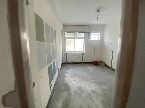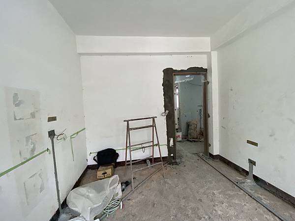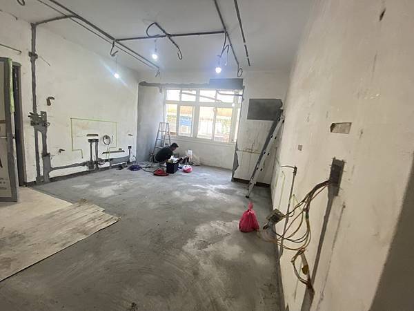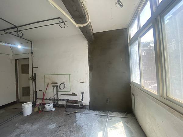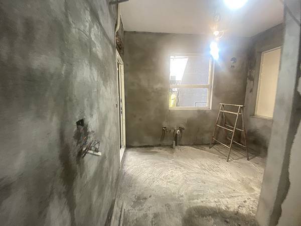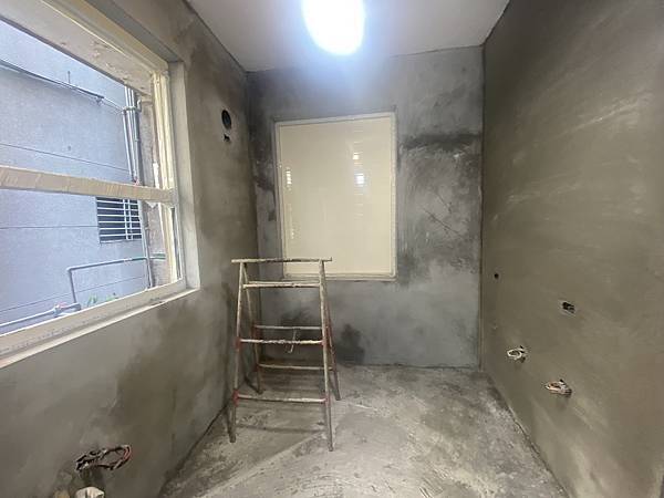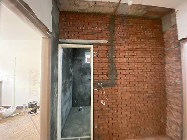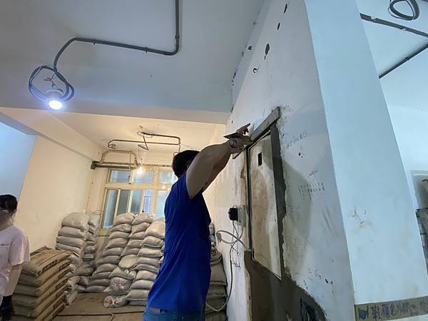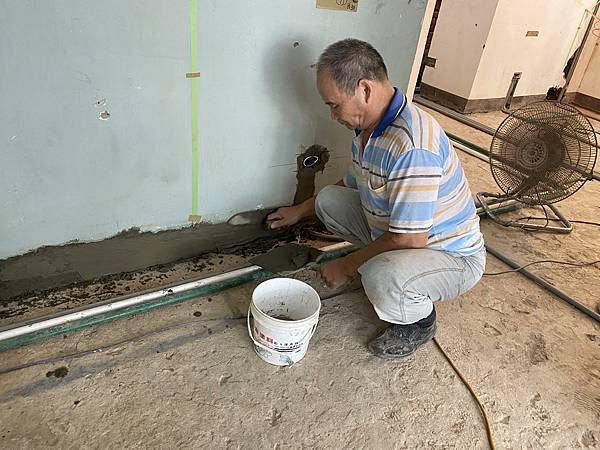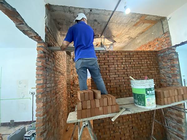 泥作進場施工。 先砌磚,如上圖所示。 先針對坑洞做修補,如下圖