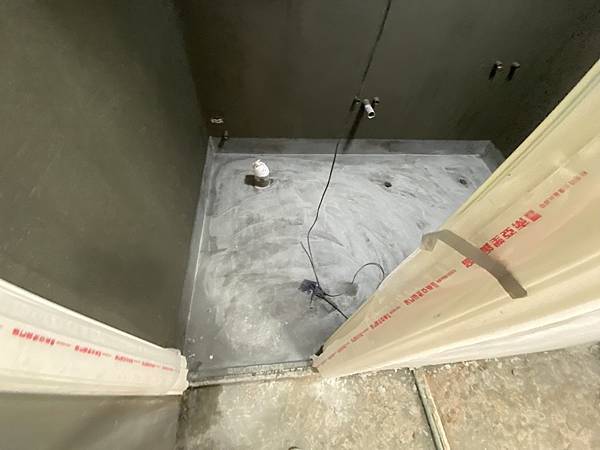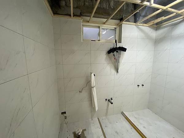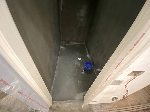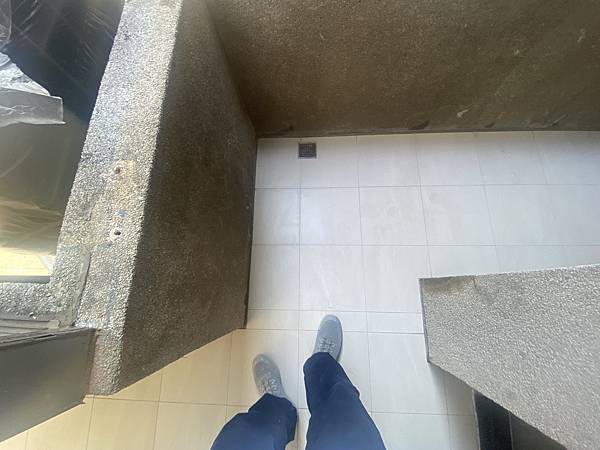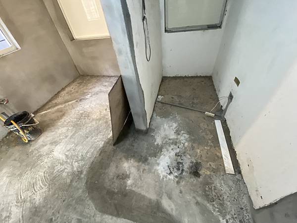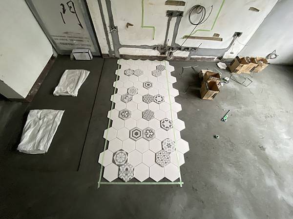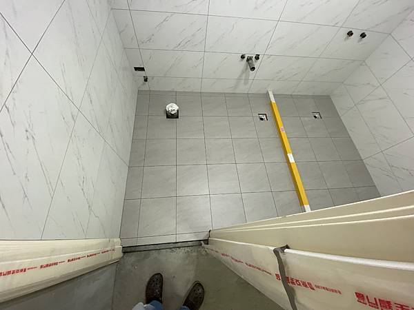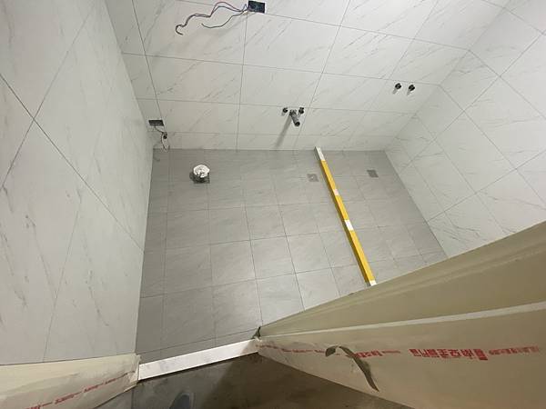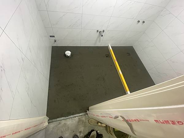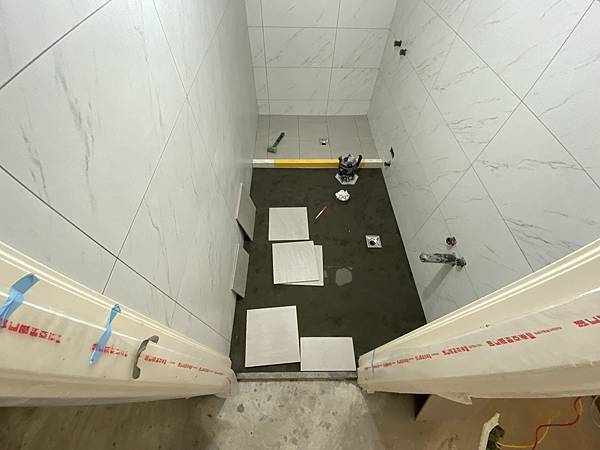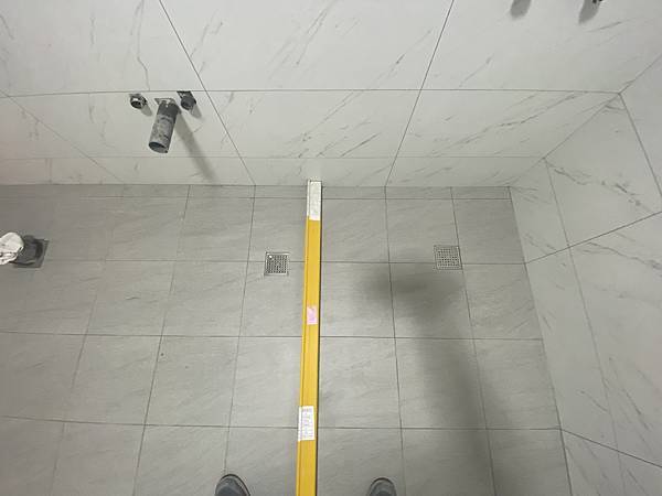 這邊要強調一下,因為客人希望地板越低越好,因此,地板排水沒有變動。 所以兩個排水孔不見得可以在四片磁磚的交接處,這時候會需要取捨,一般來說,以濕區排水為考量下去抓。 第二個要說的是,因為人造石分割的關係,乾溼區的磁磚大小,無法連續整磚,這是也是常見要先告知的部分,避免爭議。