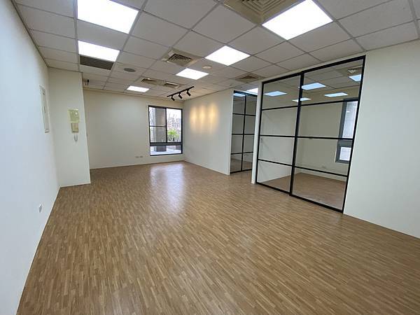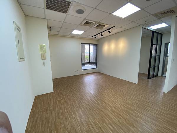 辦公室簡易的裝潢完成了。主要是隔間、水電、塑膠地板這些基本的工程,這一場比較特別的是雙向緩衝的鐵件拉門,這個拉門尺寸很大,會議室的一片拉門尺寸是120cm*240cm。 上下圖是玄關投射燈打公司logo牆面