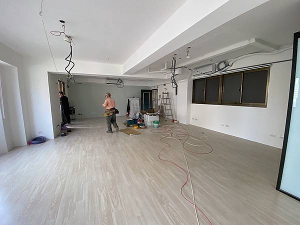因為地板要還給房東,所以我們用黑底打底,後續在上面貼塑膠地板,這樣就不會造成原本地面的黏膠汙染,日後好歸還。 黑底先做,也可以替代保護層,就可以節省一筆費用上下塗黑底當作保護,跟拆除清運快要完成的照片。