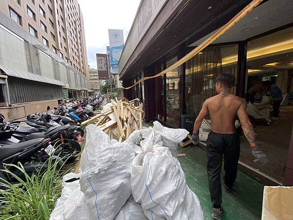 一邊拆除清運,一邊裝袋整理現場垃圾