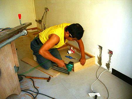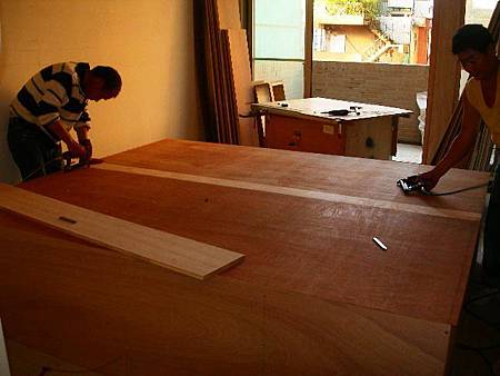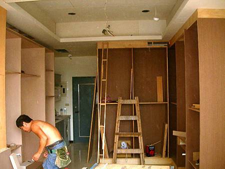 小套房裝潢施工圖:衣櫃的組裝;父親與阿輝師兩人通力合作