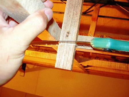 將縱向角木多餘部分去除,這裡有兩個小技巧要注意,一個是上釘子的時候,釘子要儘量往上,避免以後鋸子去鋸到釘子,第二個是鋸子要鋸的時候要斜切,避免縱向角木凸出導致骨架無法呈現水平面。