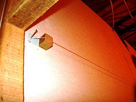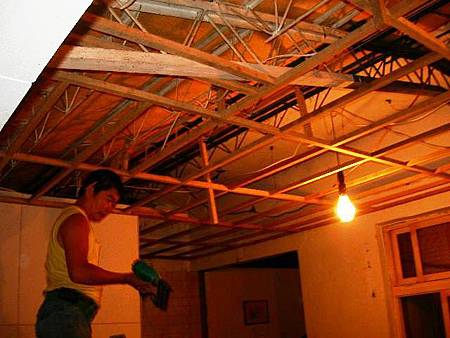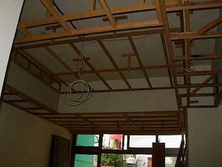 下圖可以看到整個天花板骨架完成了,一尺一根角料標準作法,接著就是吊天花板,下圖各位仔細看除了平面的骨架外,還有幾根縱向的角料懸在那裏,這些就是要給予天花板往上的拉力。它可以讓天花板更有力,也是維持天花板平面的關鍵。