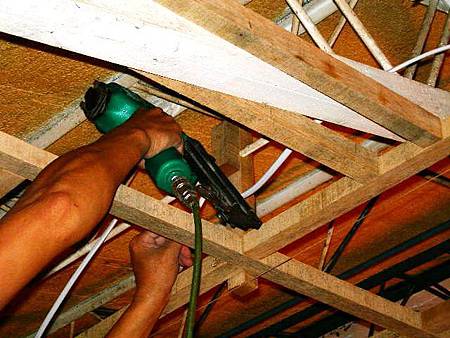 上骨架;角料與角料間要隔 34cm ~ 38cm,標準的是一尺一根角料,很多偷工減料的人,會拉到 45cm甚至更開ㄧ根角料,這是很夭壽的做法,除了省料,重要的是省工;有些天花板整個崩塌就是這樣造成的。